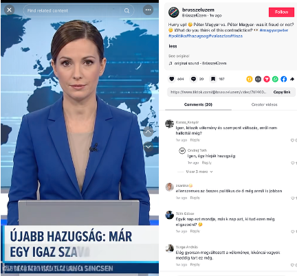 Uno degli account della rete TikTok, “BrüsszelÜzem” (“Operazione Bruxelles”), ha pubblicato sei servizi giornalistici falsi, in cui una presentatrice generata con l’IA riferisce di presunti problemi di gestione della rabbia di Magyar. Spesso, in questi servizi compaiono “esperti”, anch’essi generati artificialmente. Al 16 marzo 2026, questi video avevano totalizzato 385.000 visualizzazioni e 5.400 like.